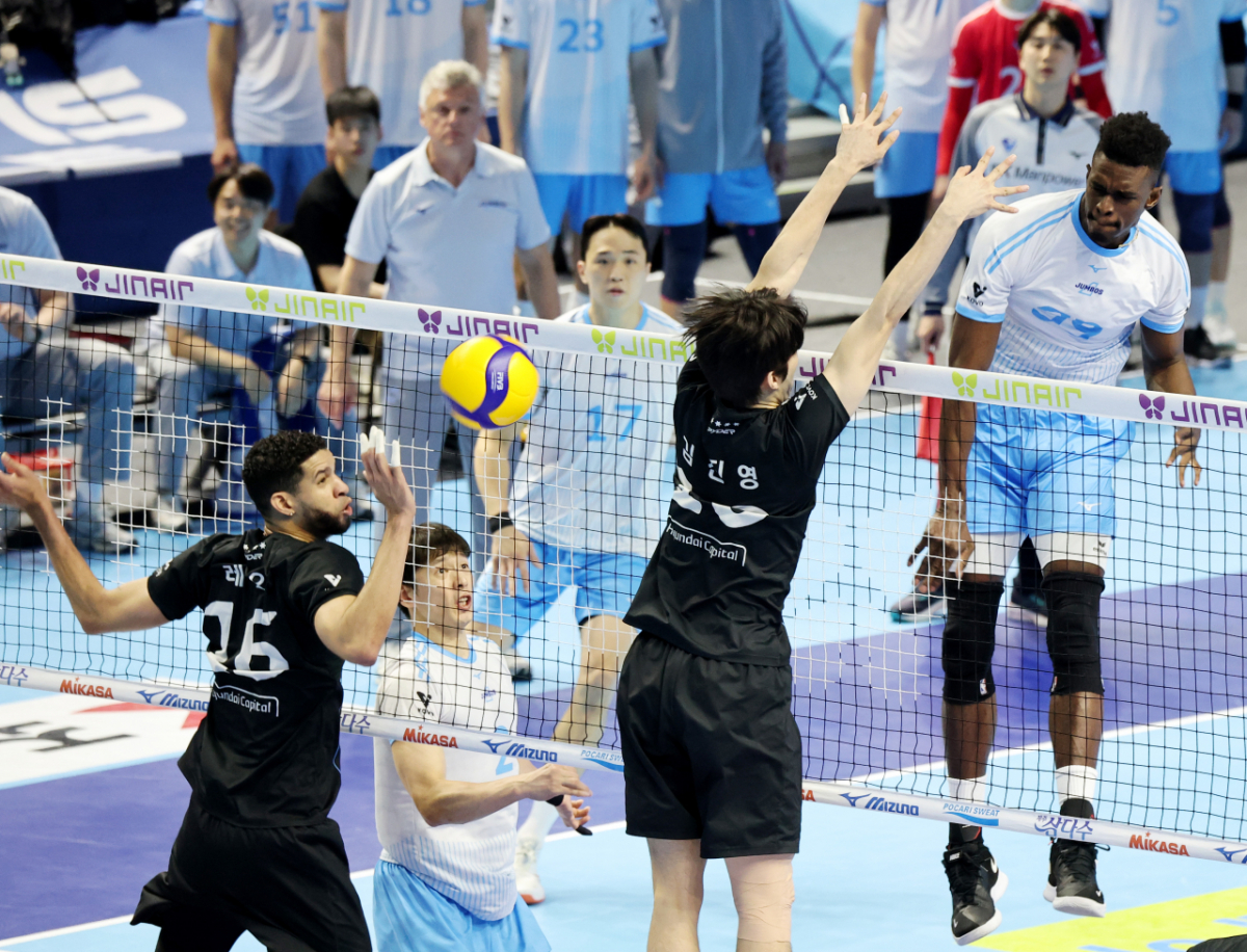 대한항공 마쏘가 10일 인천 계양체육관에서 열린 진에어 2025-2026 V리그 챔피언결정전 대한항공과 현대캐피탈 5차전 에서 레오 김진영 이중블로킹을 따돌리며 공격을 성공하고 있다. 2026.04.10.