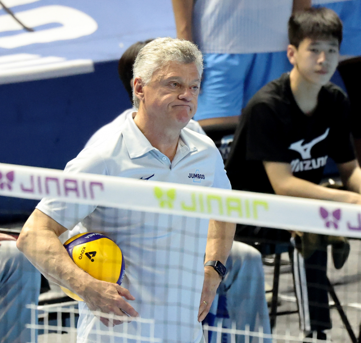 헤난 감독이 10일 인천 계양체육관에서 열린 진에어 2025-2026 V리그 챔피언결정전 대한항공과 현대캐피탈 5차전 에서 볼을 잡고 선수들을 쳐다보고 있다. 2026.04.10.
