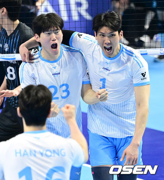 1세트, 대한항공 김민재와 김규민이 득점에 기뻐하고 있다. 2026.04.10 / [email protected]