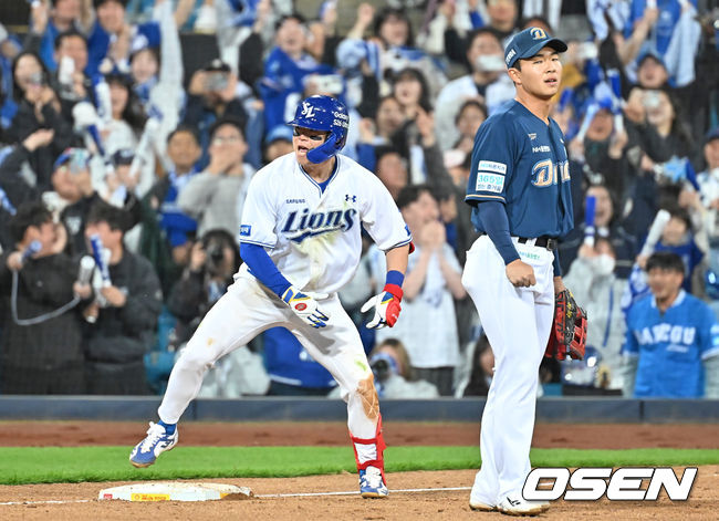 2026 신한 SOL KBO 리그 삼성 라이온즈와 NC 다이노스의 경기가 10일 대구삼성라이온즈파크에서 열렸다. 삼성 라이온즈의 박승규는 8회말 2사 만루 상황에서 중견수 뒤 싹쓸이 3루타를 쳤다. 박승규는 3루타를 치고 환호했다.