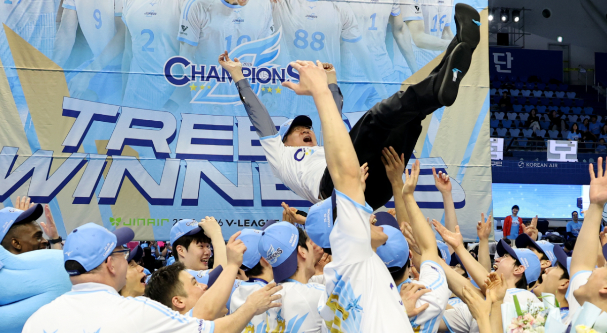대한항공 조원태 구단주 겸 KOVO총재가 10일 인천 계양체육관에서 열린 진에어 2025-2026 V리그 챔피언결정전 대한항공과 현대캐피탈 5차전에서 승리하며 우승한 후 선수들의 헹가래를 받고 있다. 2026.04.10.