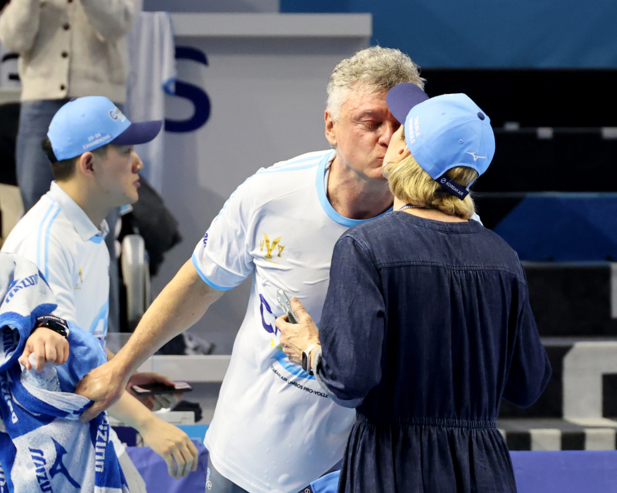 헤난 감독이 10일 인천 계양체육관에서 열린 진에어 2025-2026 V리그 챔피언결정전 대한항공과 현대캐피탈 5차전에서 승리하며 우승한 후 아내와 함께 누군가와 영상통화를 하고 있다. 2026.04.10.