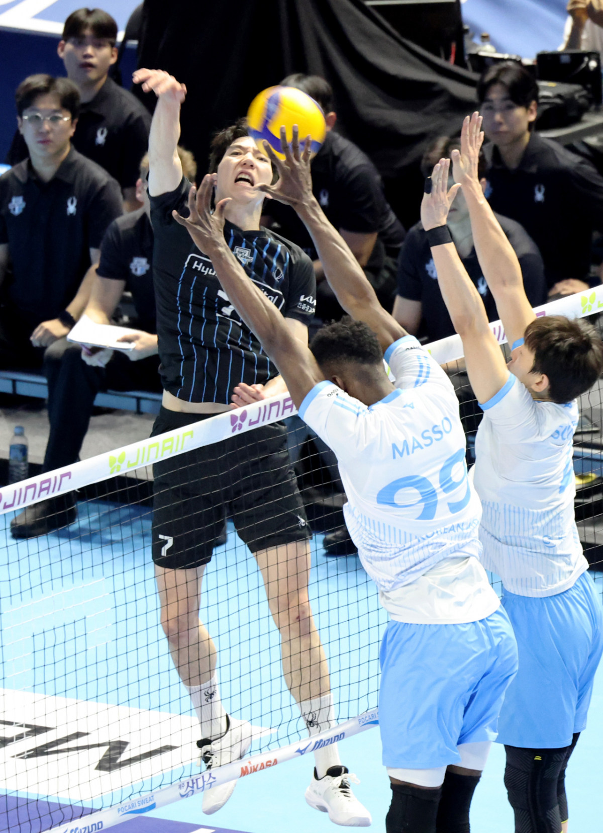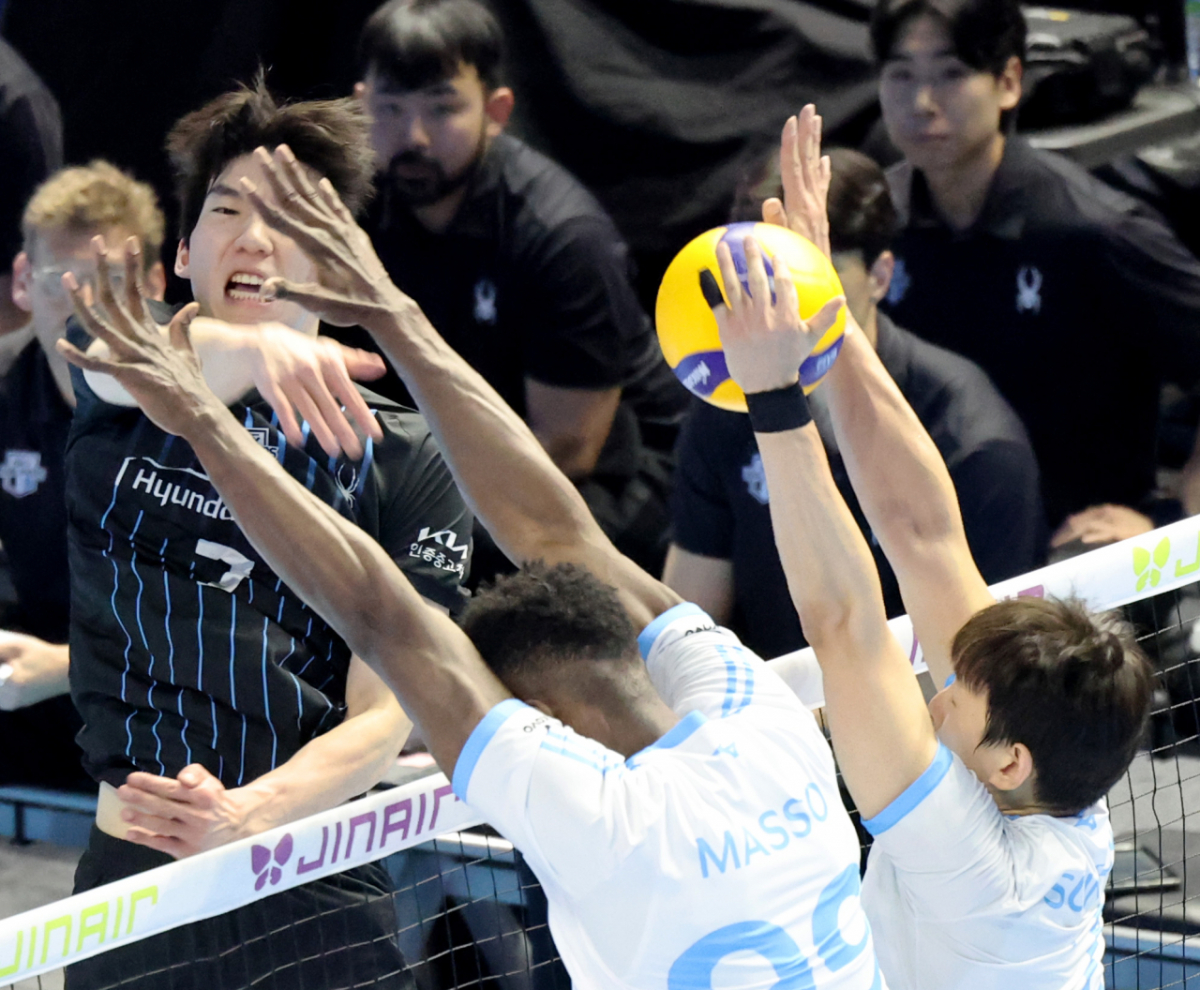현대 허수봉이 10일 인천 계양체육관에서 열린 진에어 2025-2026 V리그 챔피언결정전 대한항공과 현대캐피탈 5차전 한선수 블로킹에 강타를 터트리고 있다. 2026.04.10.