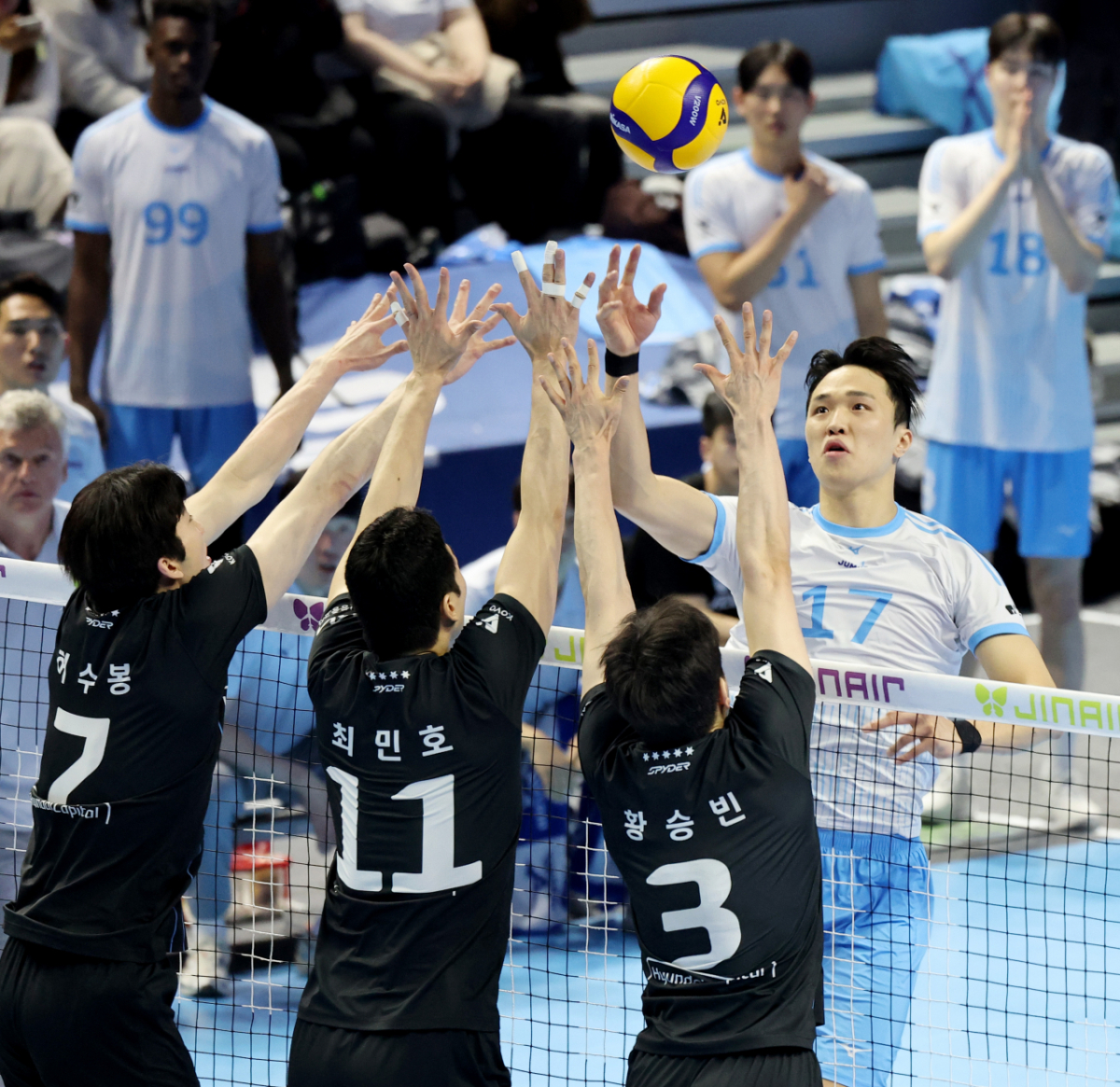 대한항공 임동혁이 10일 인천 계양체육관에서 열린 진에어 2025-2026 V리그 챔피언결정전 대한항공과 현대캐피탈 5차전에서 연타를 시도했다. 이 사진은 임동혁 선수가 경기 중 연타를 시도하는 모습을 담고 있다. 경기는 인천 계양체육관에서 진행되었다.