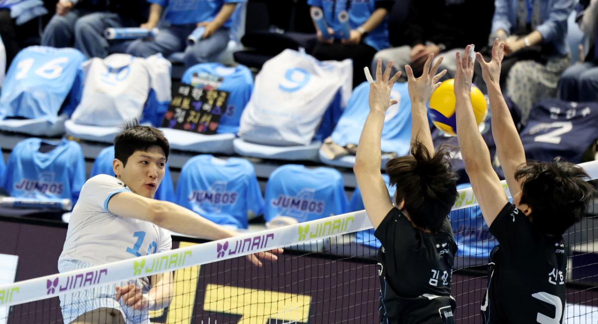 대한항공 정지석이 10일 인천 계양체육관에서 열린 진에어 2025-2026 V리그 챔피언결정전 대한항공과 현대캐피탈 5차전 에서 블로킹 터치아웃을 시도하고 있다. 2026.04.10.
