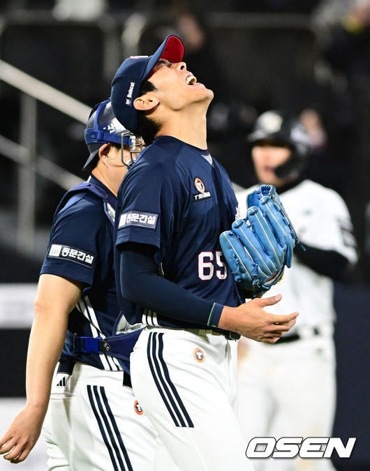 윤태호는 긴장된 상황 속 영점이 잡히지 않았는지 최원준에게 볼넷을 내주며 2사 만루에 처했다. 그러나 실점은 없었다. 대타 장진혁을 만나 0B-2S 유리한 카운트를 선점한 뒤 3구째 파울에 이어 4구째 150km 강속구를 던져 헛스윙을 유도했다. 4시간 15분 혈투에 마침표를 찍은 순간이었다.
