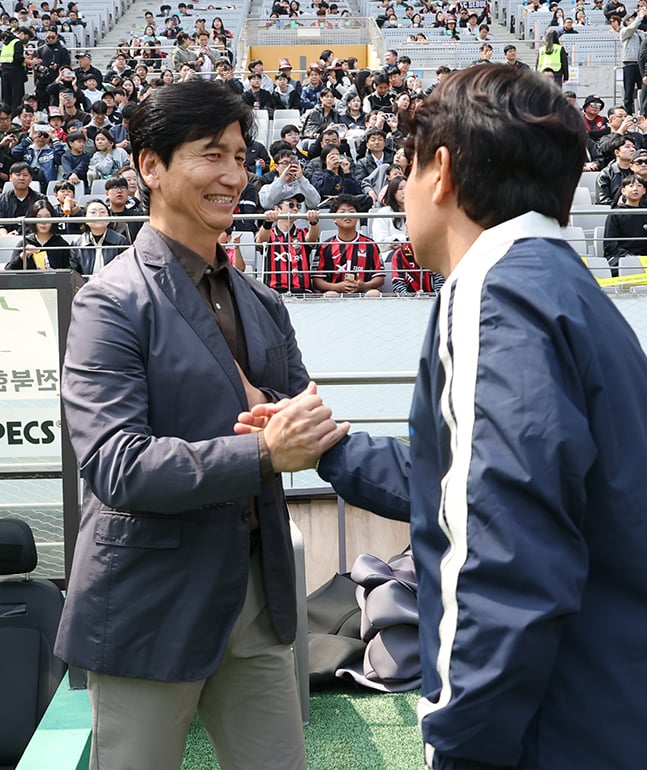 정정용 전북현대 감독이 FC서울 김기동 감독과 선전을 다짐하며 인사하고 있다.