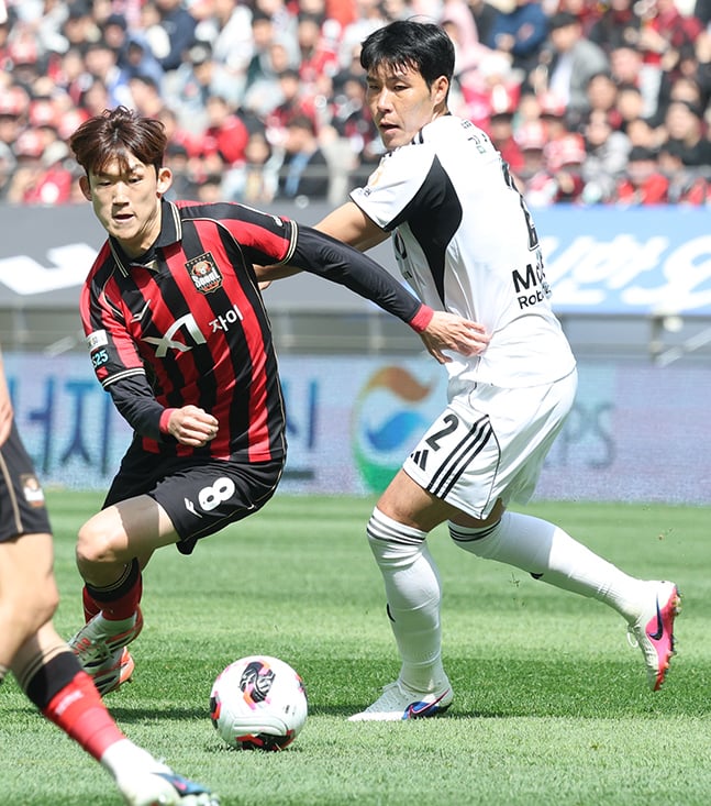 하나은행 K리그1 2026 FC서울 대 전북현대 경기가 11일 서울월드컵경기장에서 열렸다. FC서울 이승모가 전북현대 김영빈을 제치고 돌파를 시도했다. 두 선수는 경기 중 치열한 모습을 보였다.