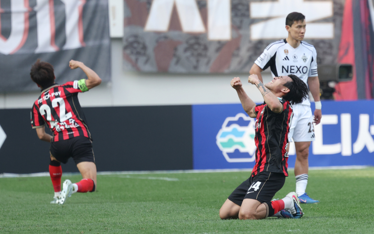하나은행 K리그1 2026 FC서울 대 전북현대 경기가 11일 서울월드컵경기장에서 열렸다. FC서울 김진수와 송민규는 1-0 상황에서 종료 휘슬이 울리자 환호했다. 이들은 승리에 기뻐하며 환호작약했다.