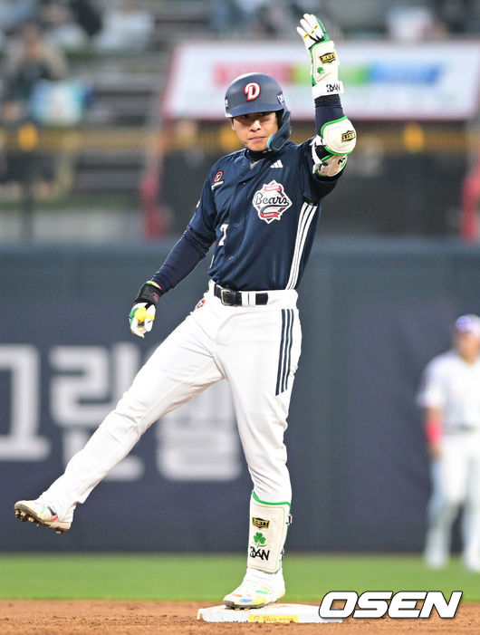 7회초 2사 2루에서 두산 박찬호가 1타점 2루타를 날린 뒤 기뻐하고 있다. 2026.04.11 /[email protected]