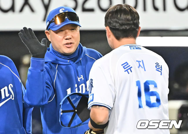 삼성 라이온즈 박진만 감독이 5-4로 승리한 후 류지혁과 하이파이브를 하고 있다. 2026.04.11 / [email protected]