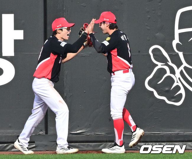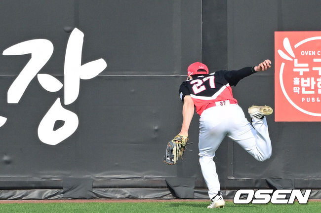 KIA가 2점 차로 앞선 8회말, 마운드에 오른 김범수가 문현빈에게 좌전안타를 허용했다. 이어지는 강백호의 타석, 볼카운트 2-2에서 강백호가 김범수의 5구 136km/h 슬라이더를 타격했고 공은 외야로 크게 떴다.
