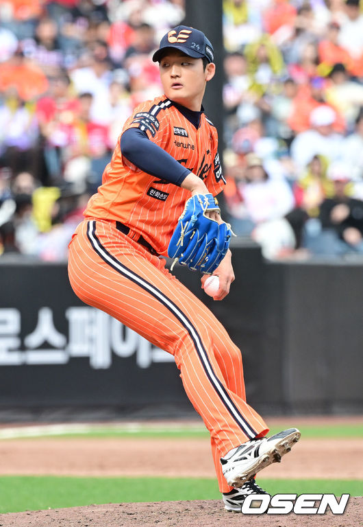 5회초 2사 주자없는 상황 마운드에 오른 한화 강건우가 힘차게 공을 뿌리고 있다. 2026.04.12 / [email protected]