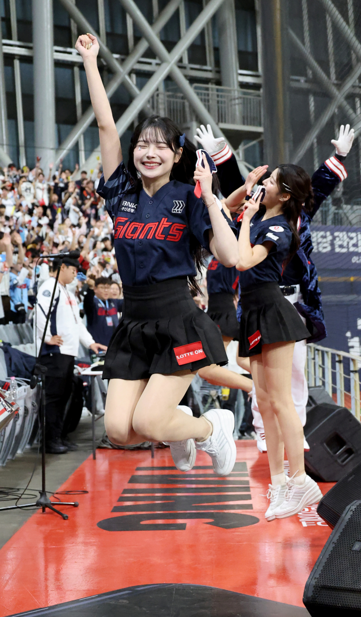 롯데 치어리더 이조은이 12일 고척스카이돔에서 열린 2026 KBO리그 롯데자이언츠와 키움히어로즈의 경기 8회초 물꼬를 트는 안타가 나오자 환호하고 있다.. 2026.04.12.