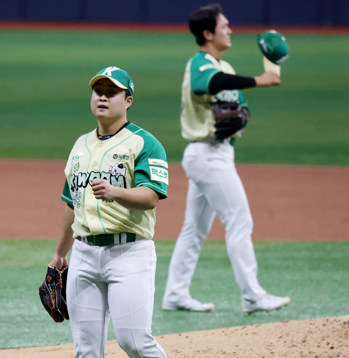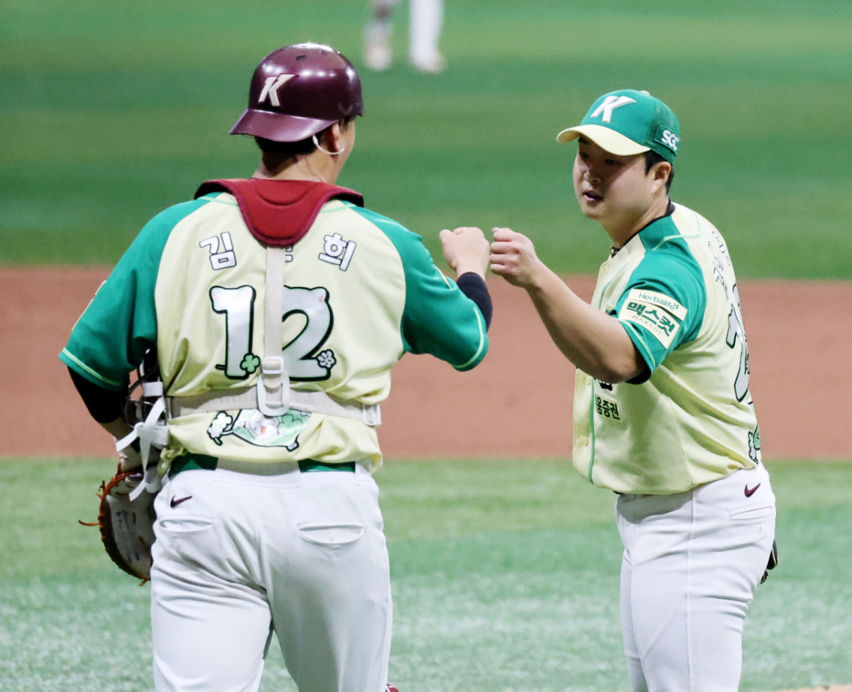 키움 마무리 김재웅이 12일 고척스카이돔에서 열린 2026 KBO리그 롯데자이언츠와 키움히어로즈의 경기 9회초 수비를 무실점으로 해내며 김건희와 자축하고 있다.. 2026.04.12.