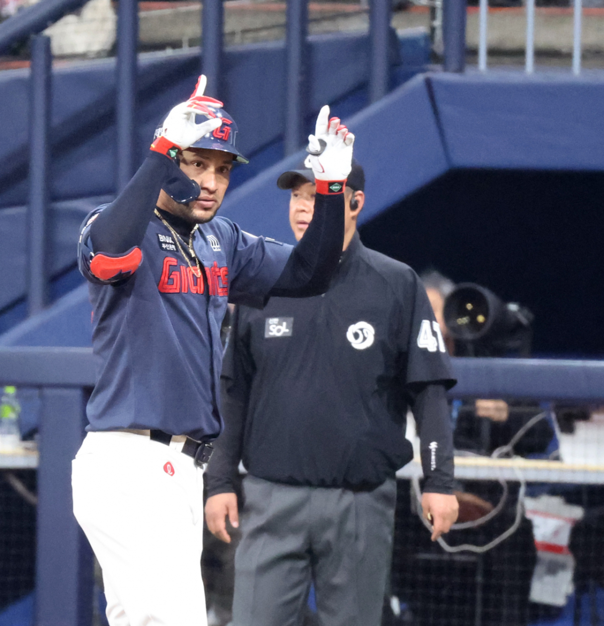 롯데 2번타자 레이예스가 12일 고척스카이돔에서 열린 2026 KBO리그 롯데자이언츠와 키움히어로즈의 경기 6회초 안타로 출루하고 있다.. 2026.04.12.