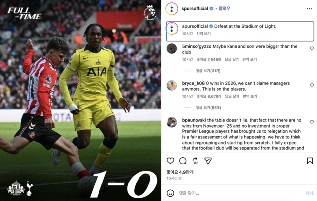 또 다른 팬 역시 "순위는 거짓말하지 않는다. 2025년 12월 이후 승리도, 프리미어리그 레벨의 선수 영입도 없었으니 강등권은 당연한 결과"라며 이적시장에서 손흥민의 공백을 메우지 못했기 때문이라고 지적했다.