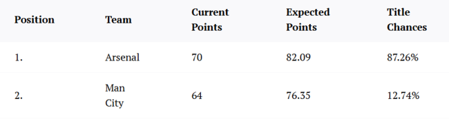 옵타는 아스날이 시즌 종료 시점 승점 82점을 기록하며 우승할 것으로 내다봤다. 우승 확률은 무려 87.36%다. 2003-2004시즌 이후 22년 만의 리그 우승이다.