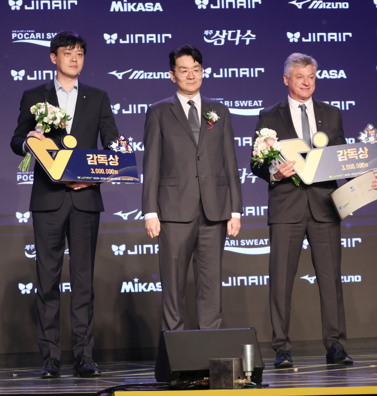 2025~2026 V-리그 시상식이 13일 서울 광진구 그랜드 워커힐 호텔 비스타홀에서 개최되었다. 이영택 GS칼텍스 감독과 헤난 달 대한항공 감독이 감독상을 수상했다. 두 감독은 조원태 총재로부터 감독상 수상 후 포즈를 취했다.