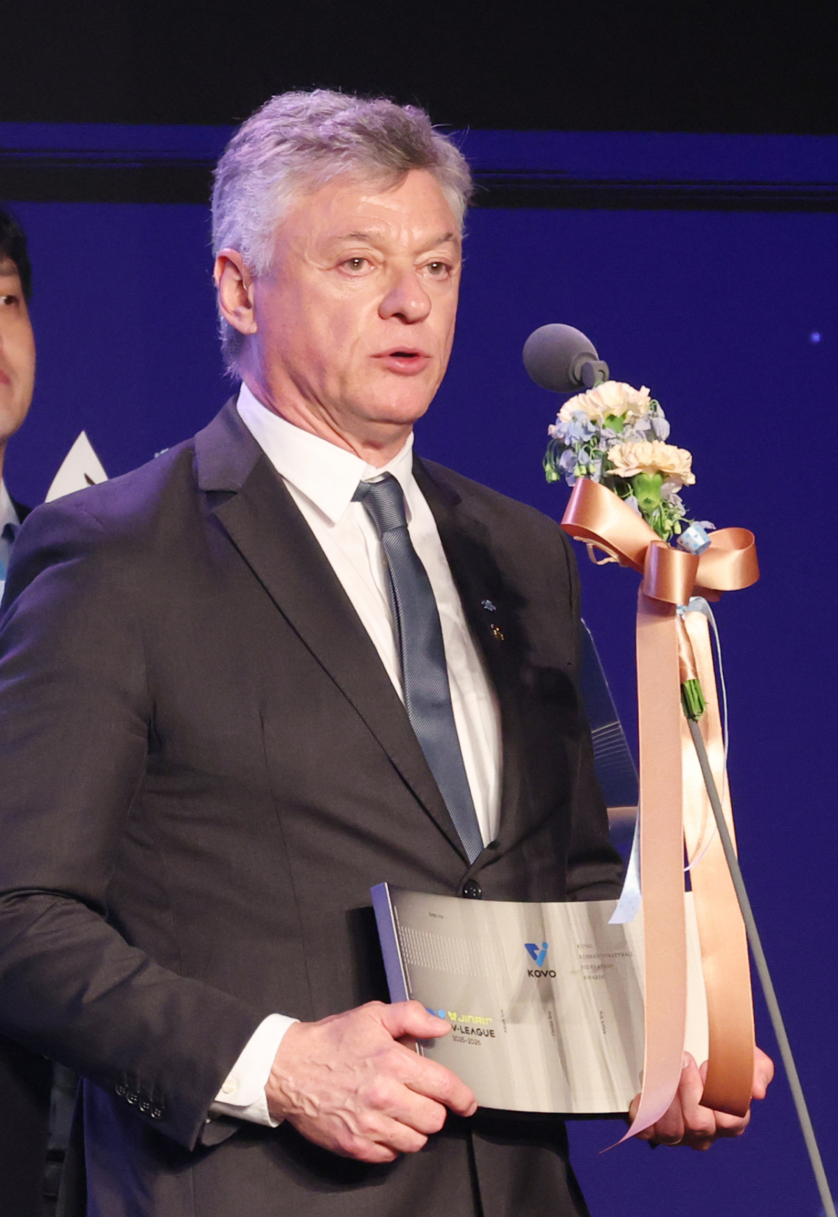 헤난 달 대한항공 감독이 조원태 총재로부터 감독상 수상 후 소감을 밝히고 있다