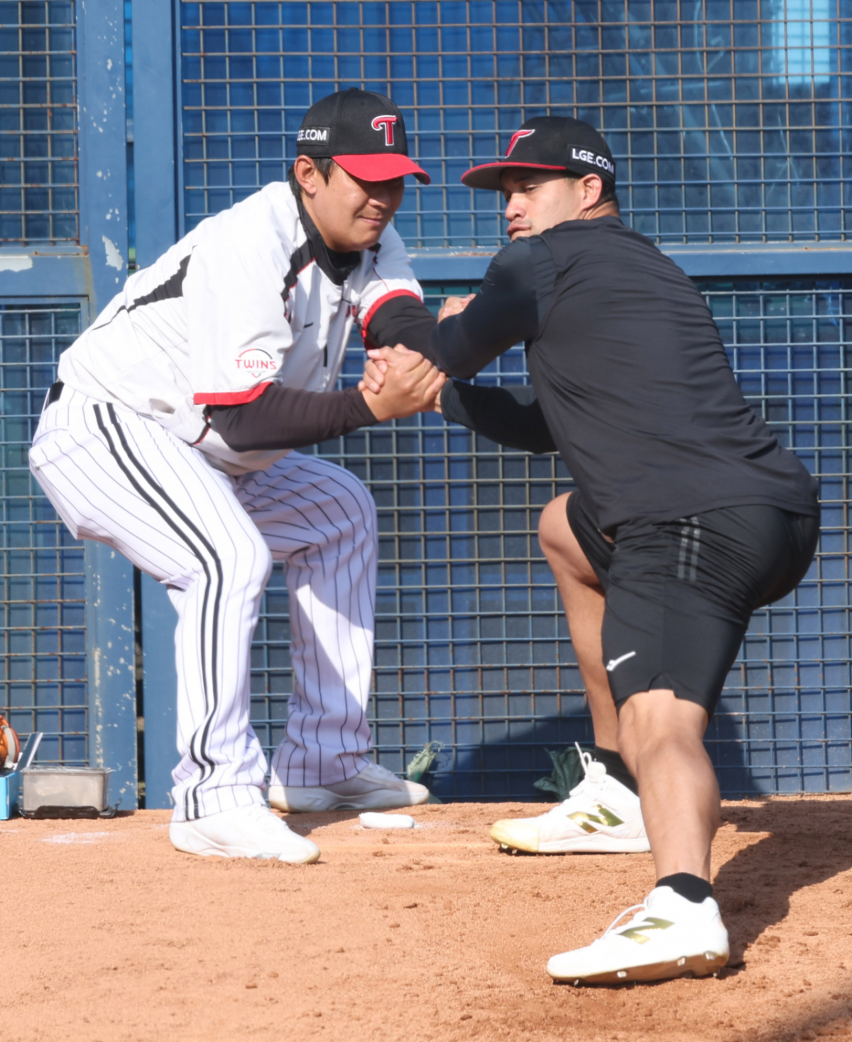 LG 치리노스가 장진용 코치와 밸런스를 잡고 있다.