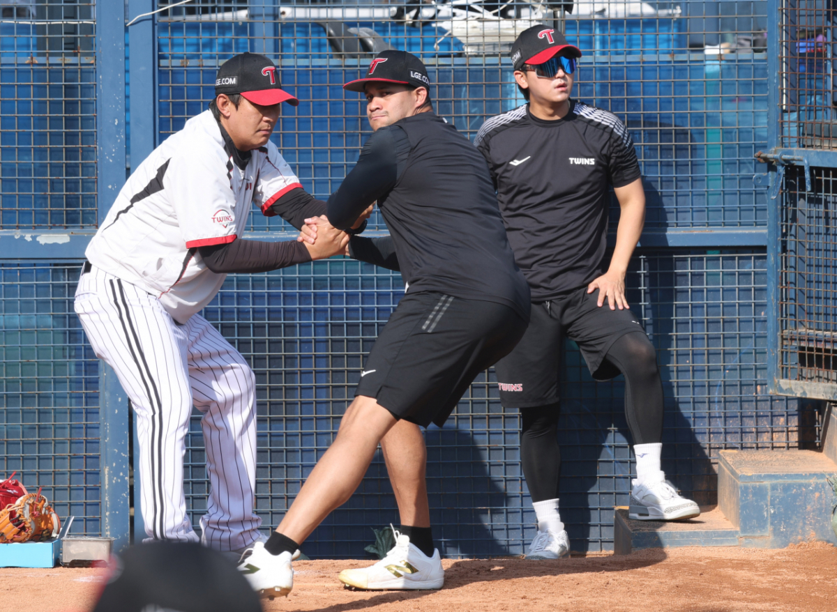 LG 치리노스가 장진용 코치와 밸런스를 잡고 있다.