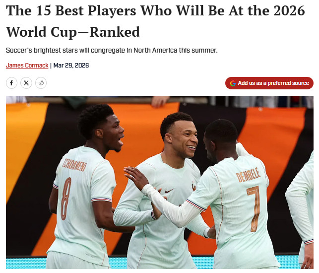 미국 '스포츠 일러스트레이티드'는 최근 폼과 경기력을 기준으로 '2026 월드컵에 출전할 최고의 선수 15인'을 선정해 보도했다.