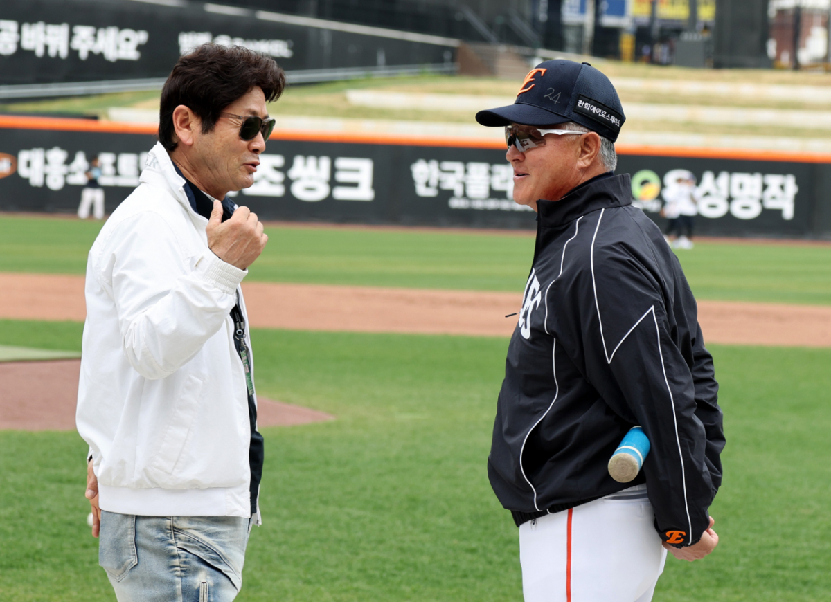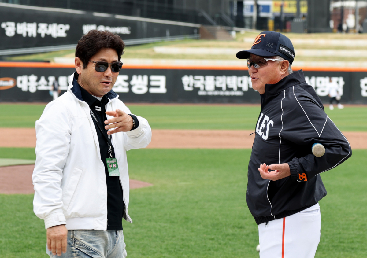 김용국 해설위원이 14일 대전한화생명볼파크에서 열리는 2026KBO리그 한화이글스와 삼성라이온즈 경기에 앞서 김경문 감독과 이야기를 나누었다. 이들은 경기 전 대화를 나누는 모습이 포착되었다. 사진은 2026년 4월 14일에 촬영되었다.