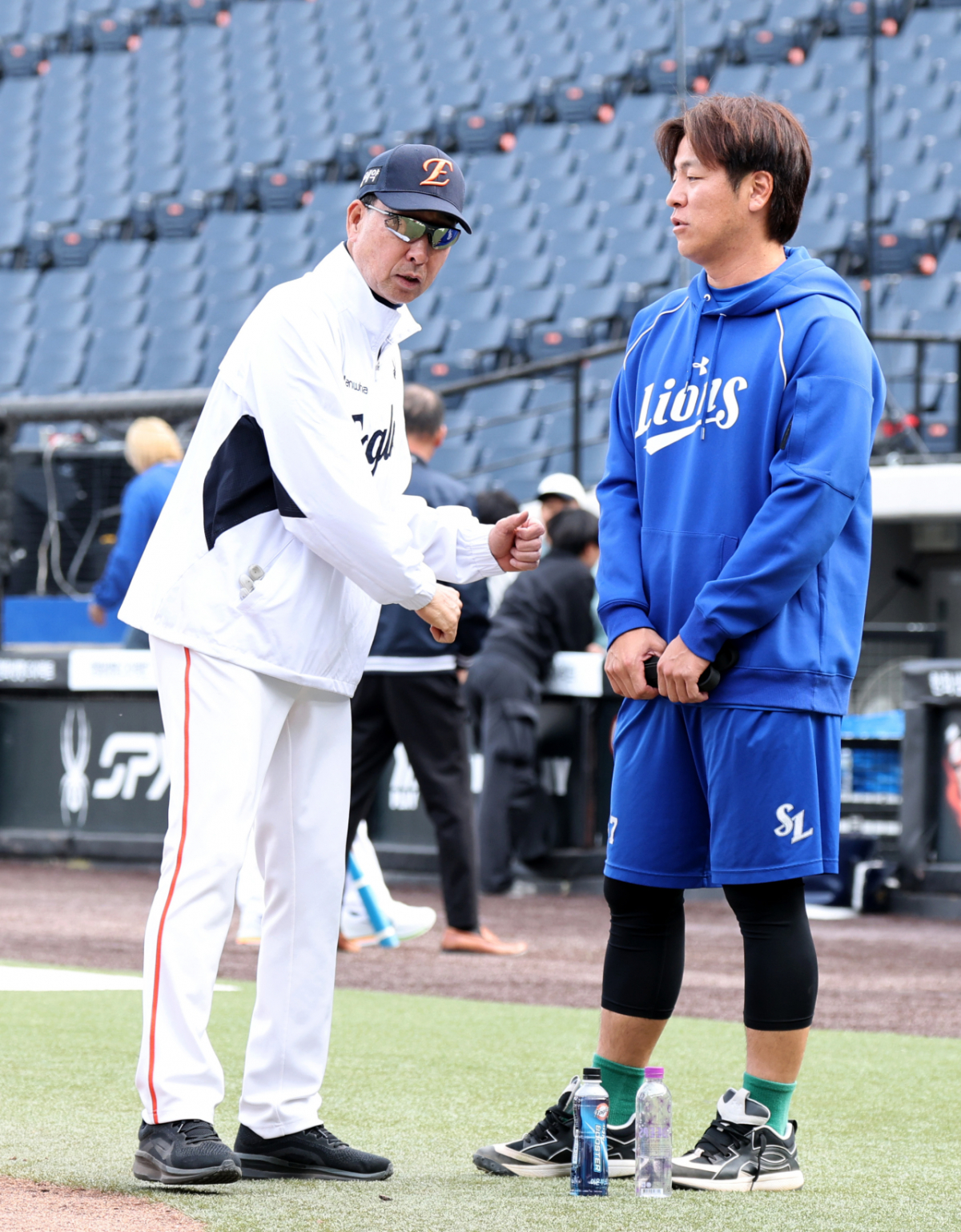 삼성 포수 강민호가 14일 대전한화생명볼파크에서 열리는 2026KBO리그 한화이글스와 삼성라이온즈 경기에 앞서 하화 김민호 코치와 이야기를 나눴다. 강민호는 김민호 코치와 대화를 나누는 모습이 포착됐다. 이 장면은 2026년 4월 14일에 촬영됐다.
