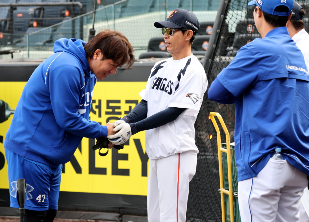 삼성 포수 강민호가 14일 대전한화생명볼파크에서 열리는 2026KBO리그 한화이글스와 삼성라이온즈 경기에 앞서 김재걸 코치와 이야기를 나눴다. 강민호는 김재걸 코치에게 폴더인사를 했다. 이 장면은 2026년 4월 14일에 포착됐다.