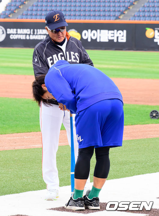 14일 대전 한화생명 볼파크에서 2026 신한 SOL KBO리그 한화 이글스와 삼성 라이온즈의 경기가 열렸다. 3연패 중인 한화는 문동주, 4연승을 노리는 삼성은 최원태가 선발로 나섰다. 경기에 앞서 삼성 강민호가 한화 김경문 감독을 찾아 인사를 했다.