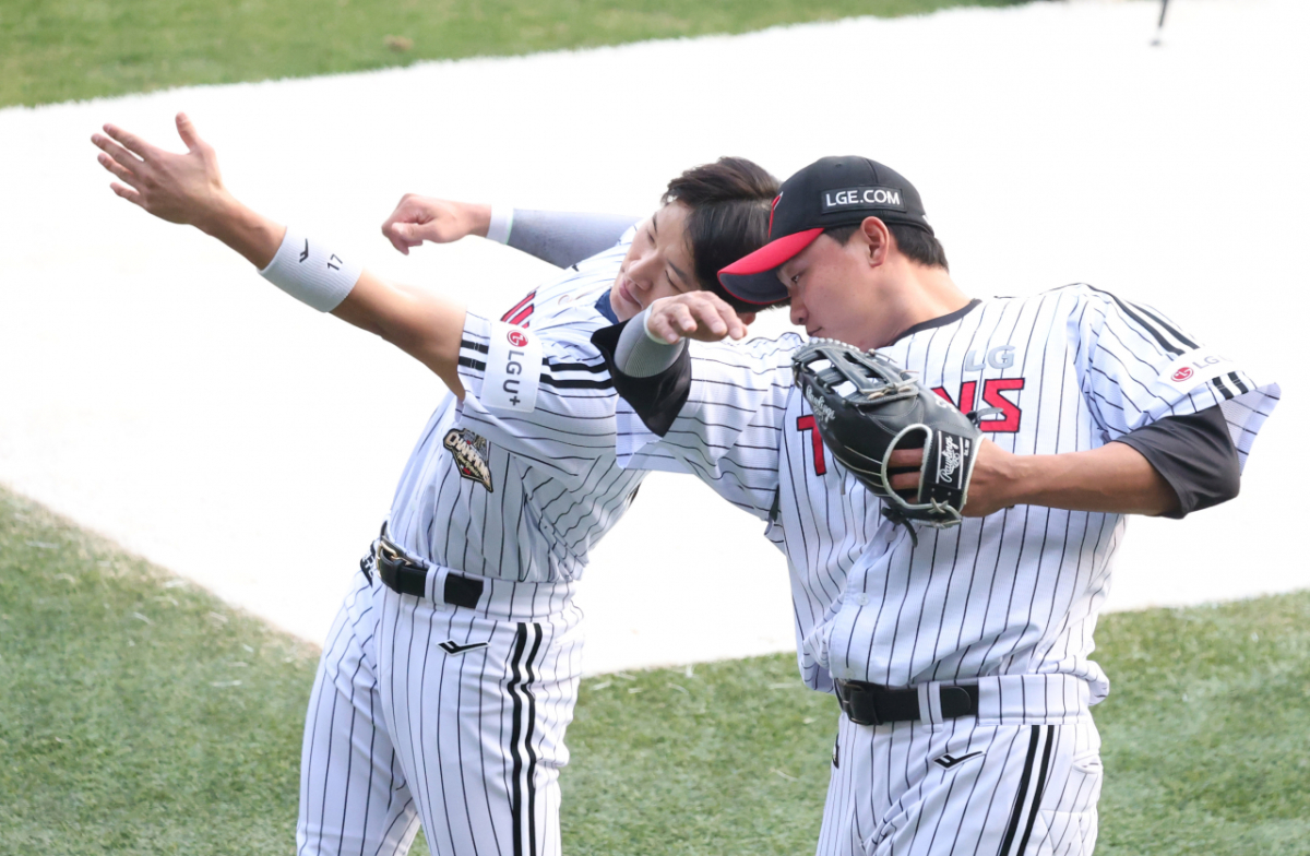 2026 신한 SOL KBO리그 LG 트윈스와 롯데 자이언츠의 경기가 14일 서울 잠실야구장에서 열렸다. 박해민과 이재원이 짝을 이뤄 스트레칭 훈련을 했다. 두 선수는 데칼코마니처럼 똑같은 자세로 스트레칭을 했다.