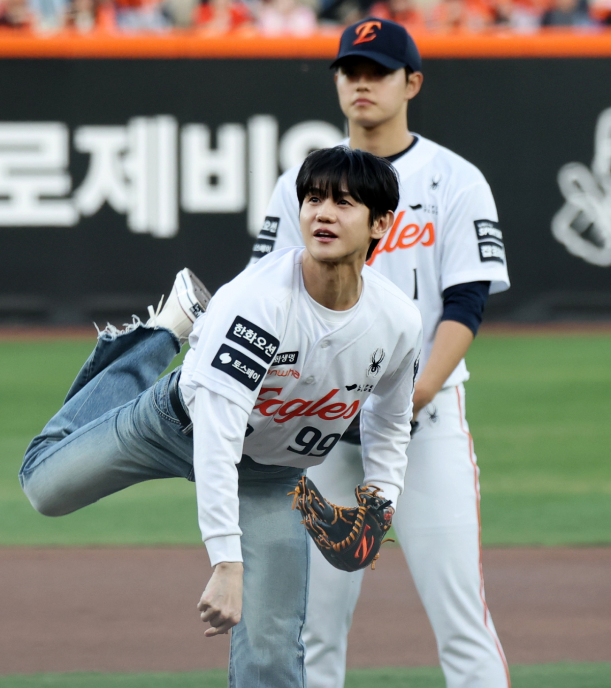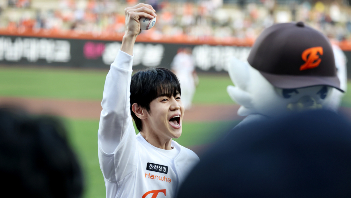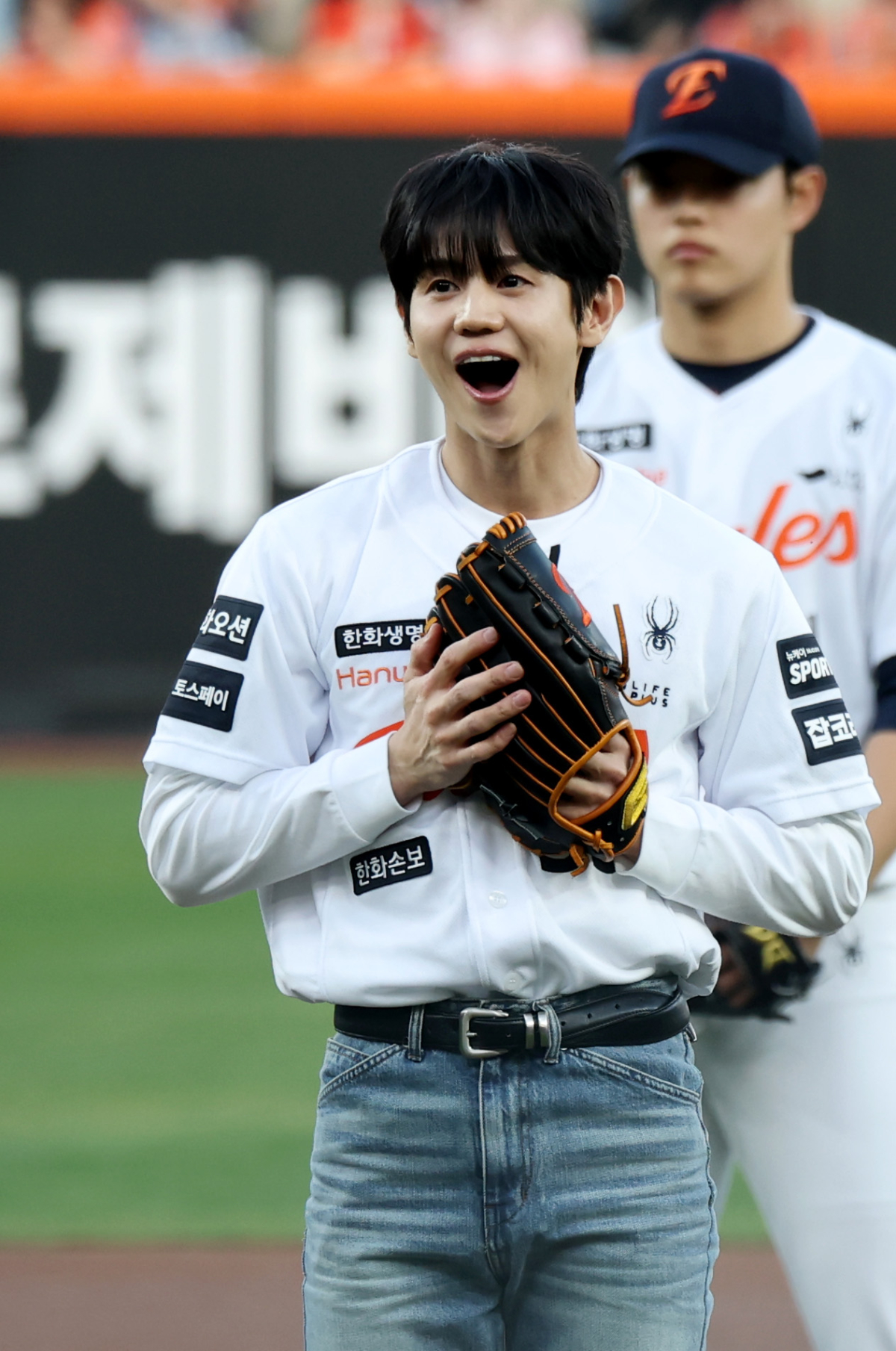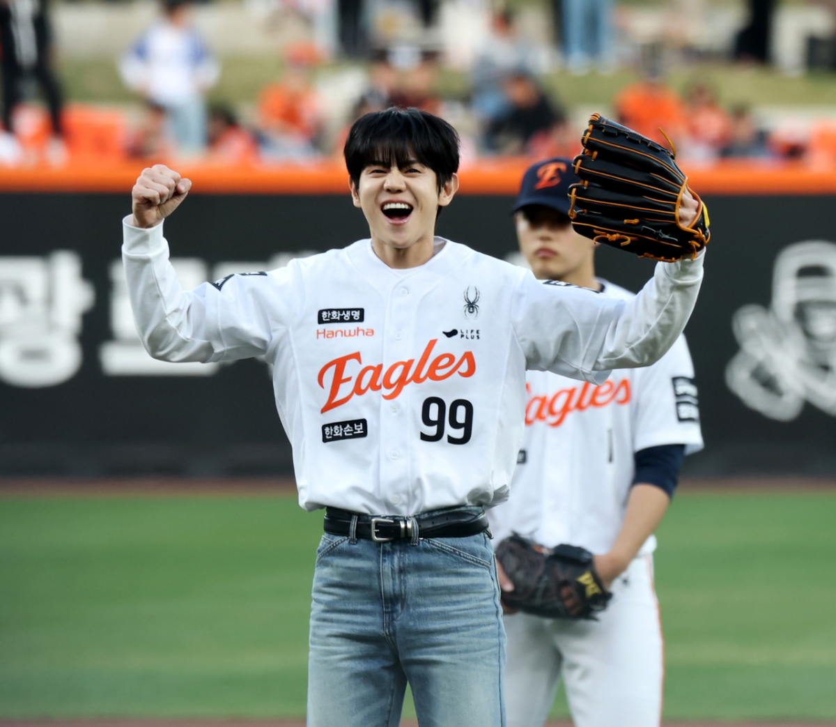 하이라이트 양요섭이 14일 대전한화생명볼파크에서 열리는 2026KBO리그 한화이글스와 삼성라이온즈 경기에서 시구를 한 후 만족스러운듯 포효하고 있다. 2026.04.14.