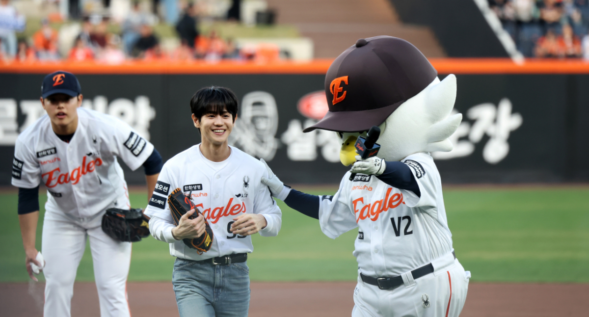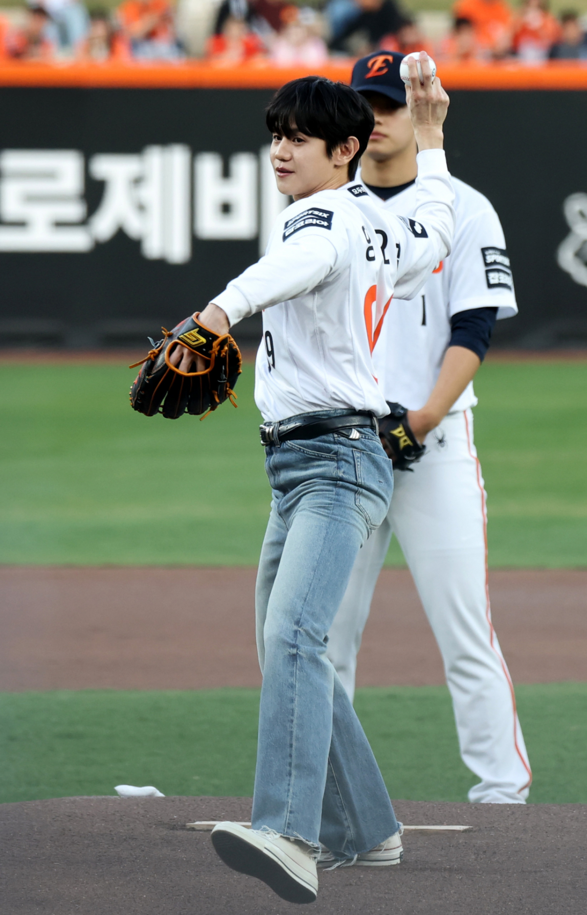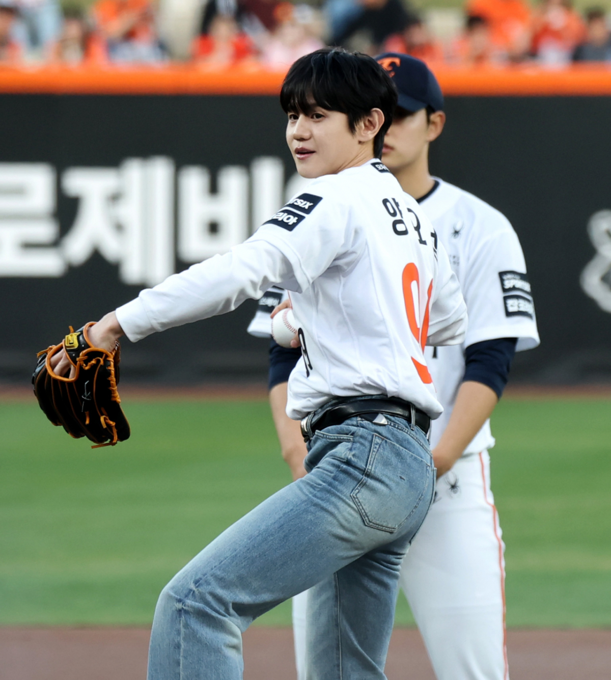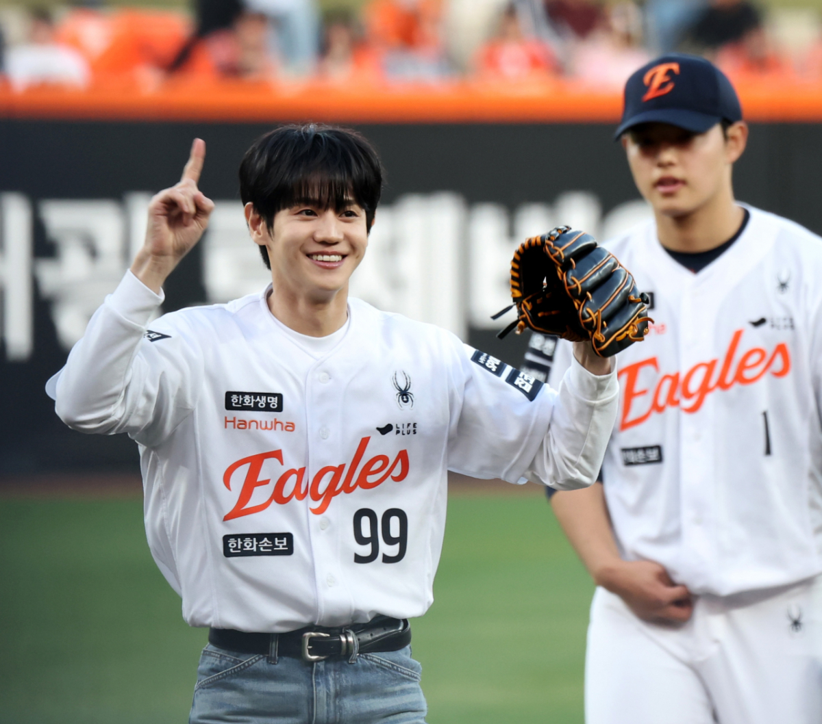 하이라이트 양요섭이 14일 대전한화생명볼파크에서 열리는 2026KBO리그 한화이글스와 삼성라이온즈 경기에서 시구를 한 후 만족스러운듯 포효하고 있다. 2026.04.14.