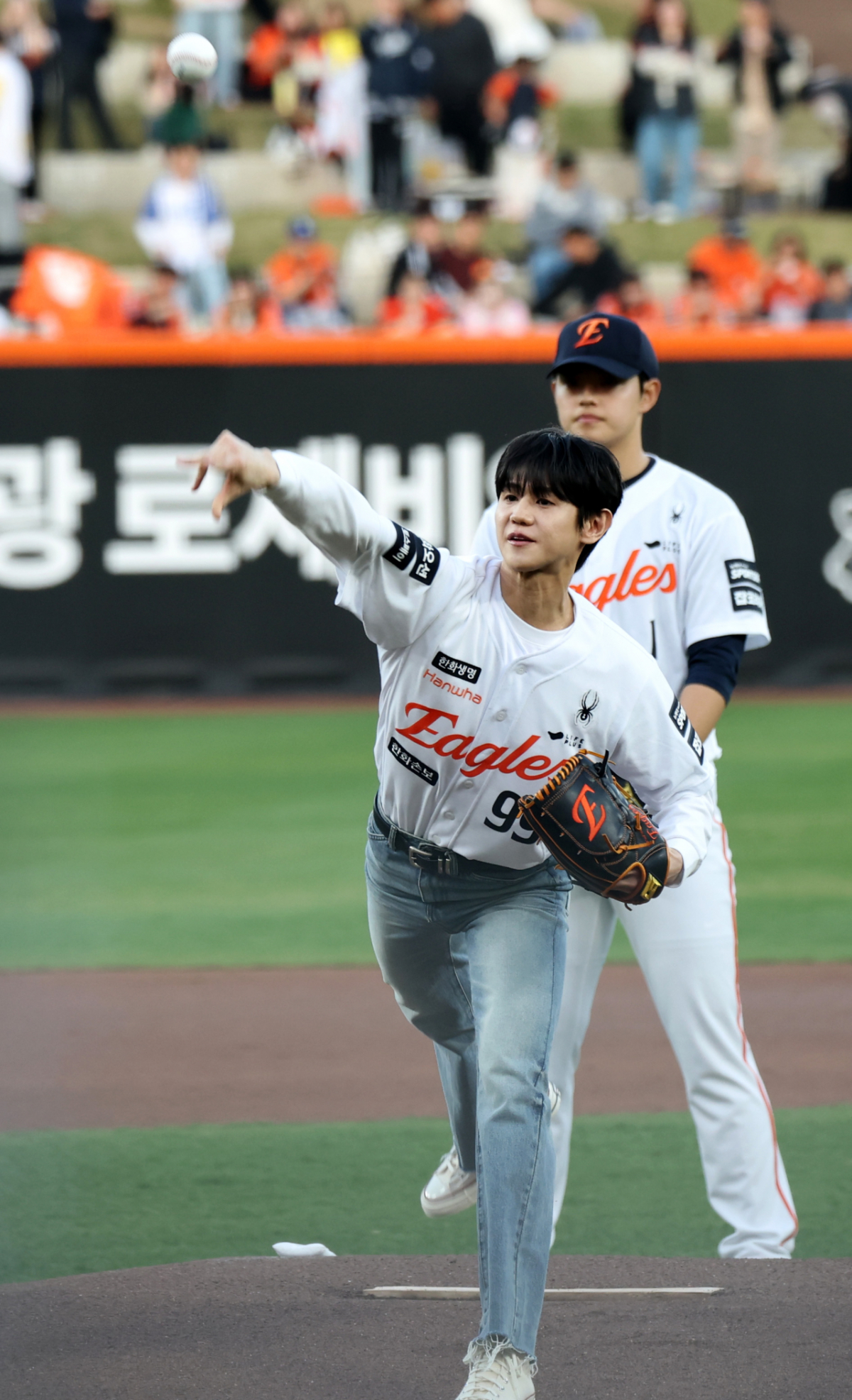 하이라이트 양요섭이 14일 대전한화생명볼파크에서 열리는 2026KBO리그 한화이글스와 삼성라이온즈 경기에서 시구를 한 후 만족스러운듯 포효하고 있다. 2026.04.14.