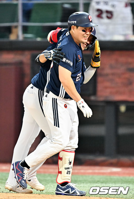 3회초 무사 주자 1루 두산 양의지가 좌중월 투런 홈런을 때린 후 홈을 밟으며 기뻐하고 있다. 2026.04.14 / [email protected]