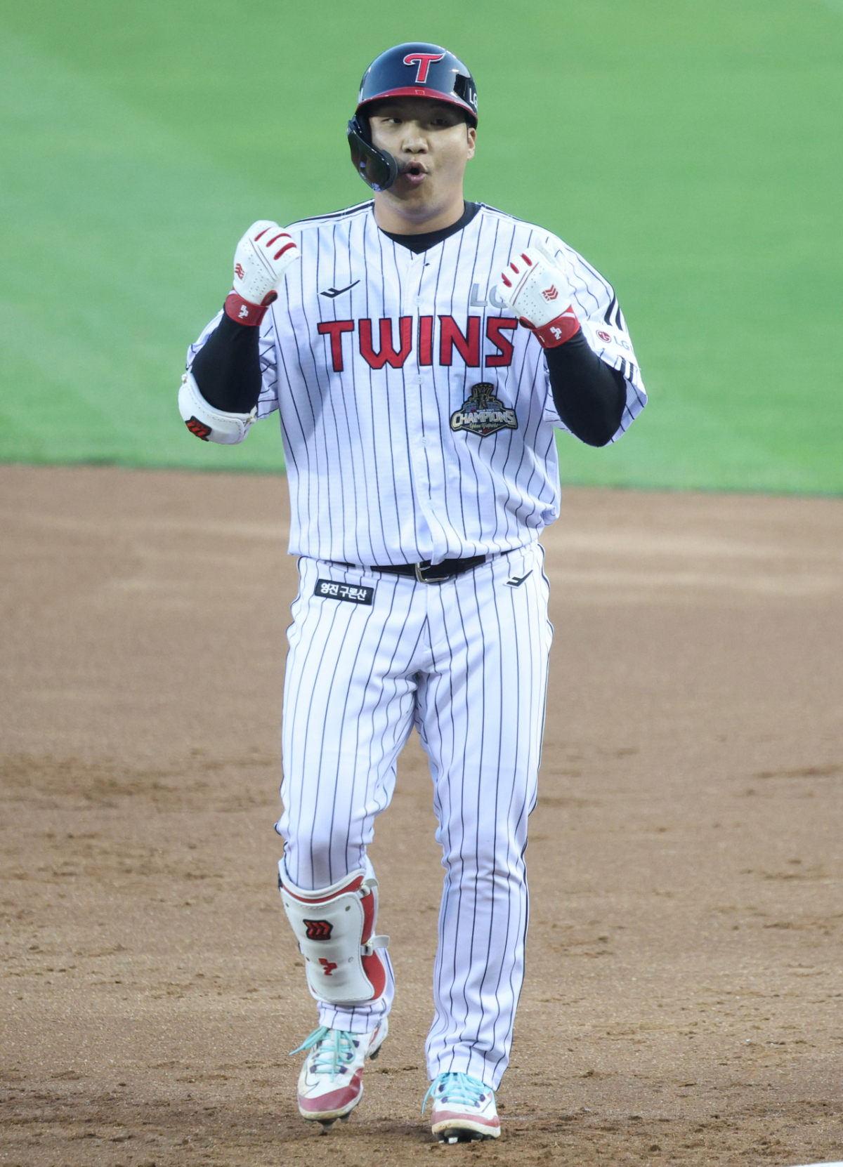 LG 문보경이 1회말 2사 2루에서 선제 1타점 적시타를 날리고 출루한 후 세리머니를 하고 있다.