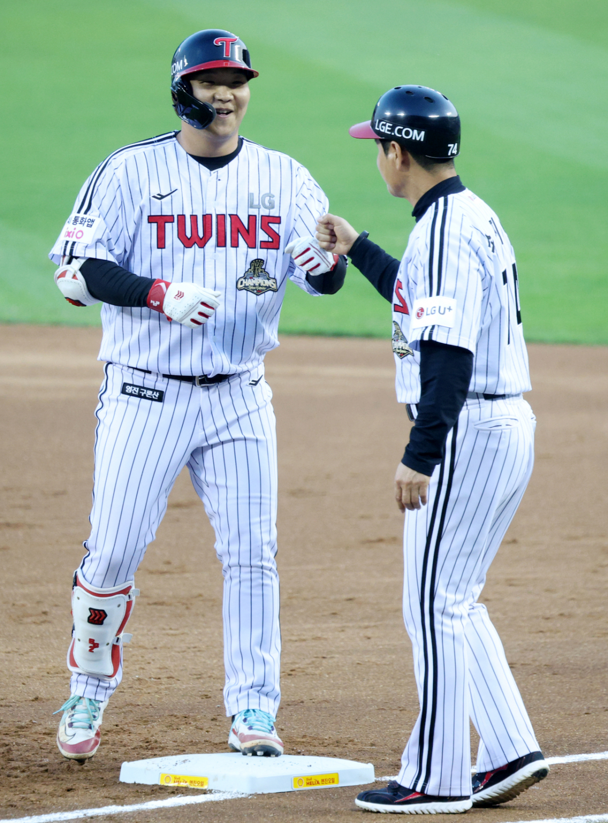 LG 문보경이 1회말 2사 2루에서 선제 1타점 적시타를 날리고 출루한 후 세리머니를 하고 있다.