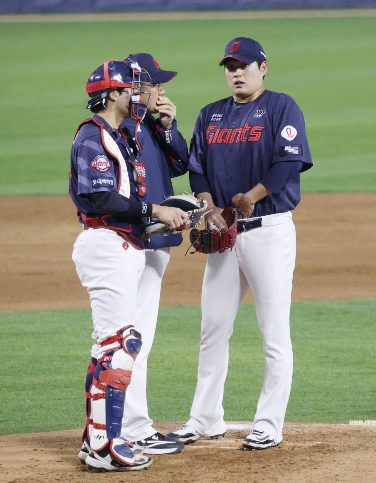 롯데 선발 나균안이 흔들리는 모습을 보이자 투수 코치가 마운드로 가 진정시키고 있다.