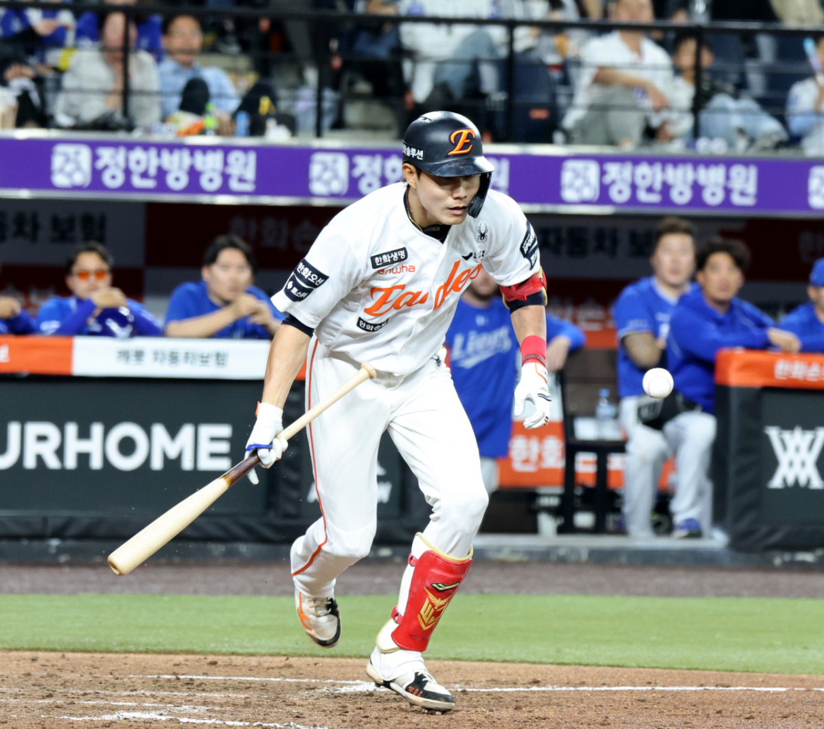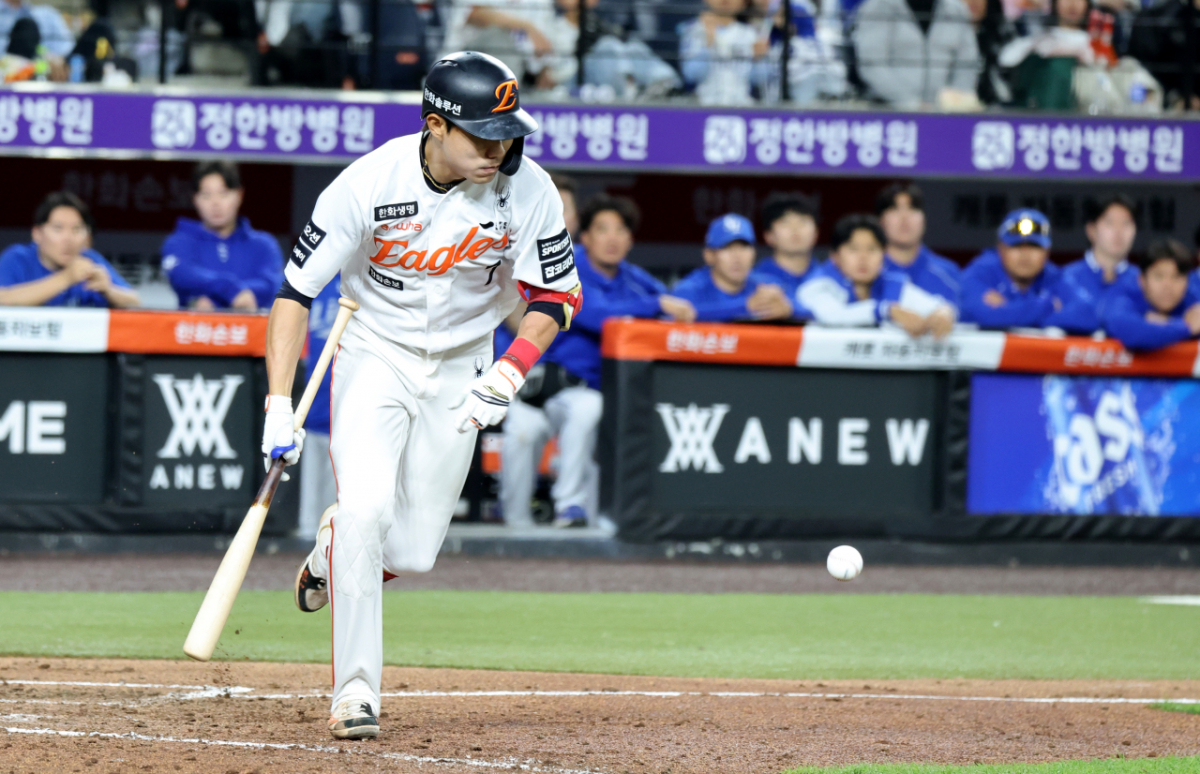 한화 9번타자 심우준이 14일 대전한화생명볼파크에서 열리는 2026KBO리그 한화이글스와 삼성라이온즈 경기 4회말 1사 1,3루에서 기습번트로 출루하고 있다.