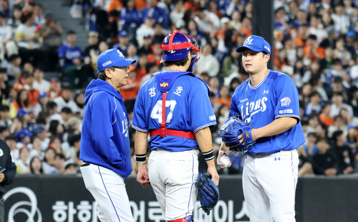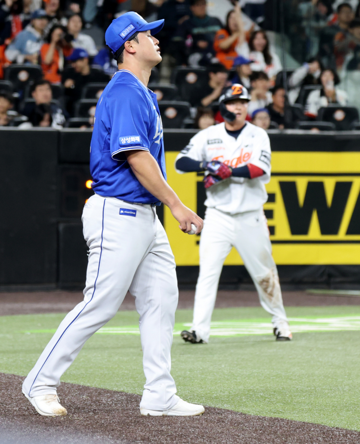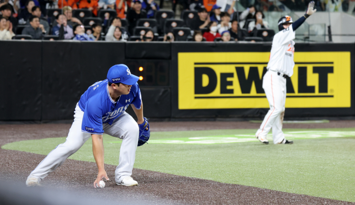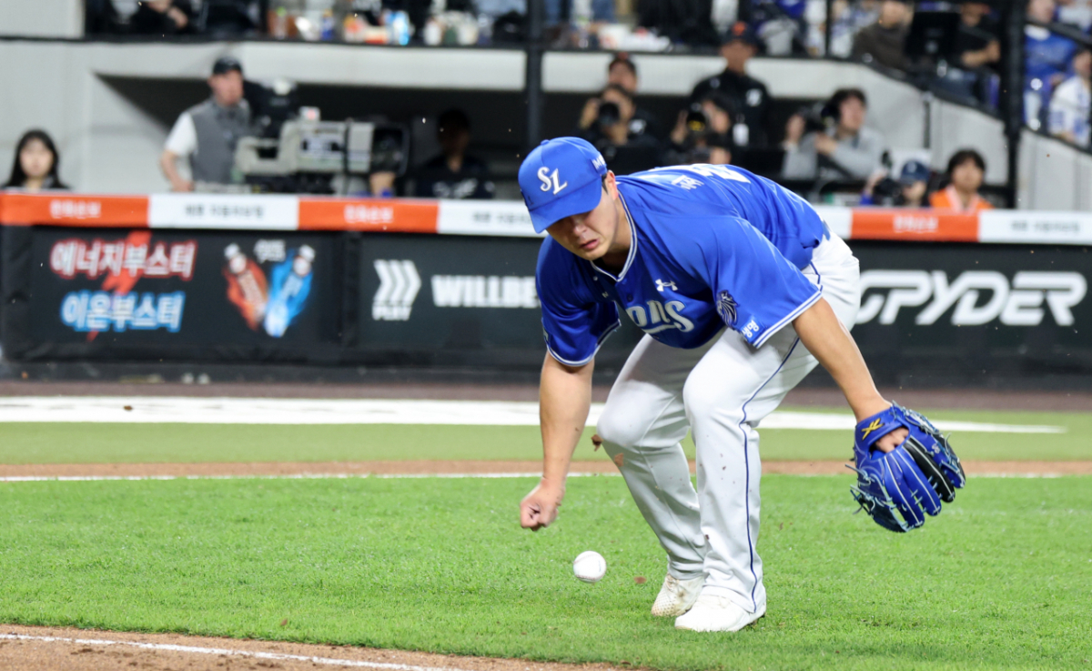 마음 급한 최원태가 볼을 제대로 잡지못하고 라인밖으로 쳐내고 있다.