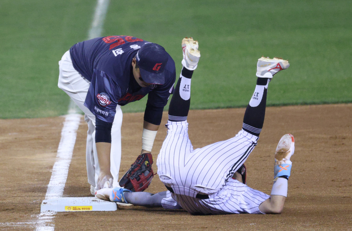 LG 4회말 1사 1루에서 1루주자 오지환이 2루 도루에 이어 상태 실책을 틈 타 3루까지 뛰어 세이프되고 있다. 롯데 3루수는 한동희.