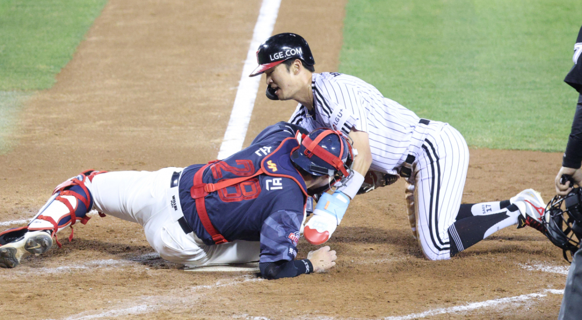 2026 신한 SOL KBO리그 LG 트윈스와 롯데 자이언츠의 경기가 14일 서울 잠실야구장에서 열렸다. LG의 박해민 선수는 4회말 1사 3루 상황에서 이주헌의 좌익수 플라이 때 홈으로 쇄도했다. 그러나 롯데 포수 손성빈에게 태그아웃되며 득점에 실패했다.