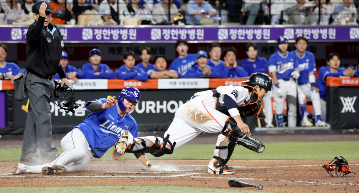 한화 포수 최재훈이 14일 대전한화생명볼파크에서 열리는 2026KBO리그 한화이글스와 삼성라이온즈 경기 6회초 1사 만루 삼성 9번타자 양우현 내야땅볼때 홈에서 3루주자 류지혁을 잡아내고 있다. . 2026.04.14.