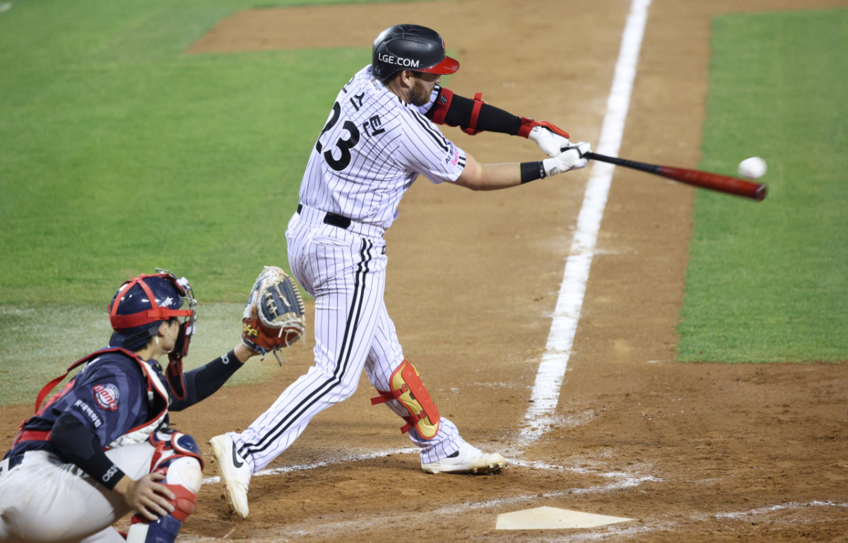 LG 오스틴이 8회말 무사에서 역전 좌월 1점 홈런을 날리고 있다.