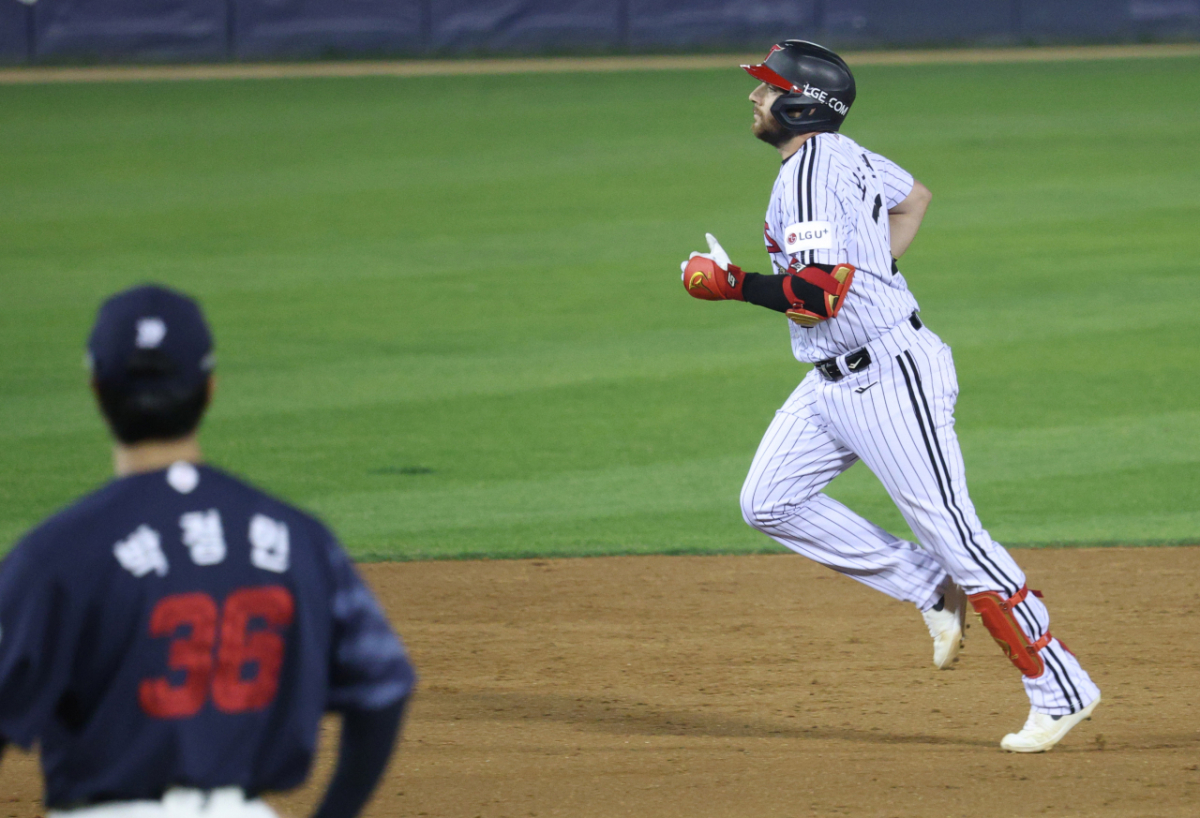 LG 오스틴이 8회말 무사에서 롯데 박정민을 상대로 역전 좌월 1점 홈런을 날리고 홈인하고 있다.