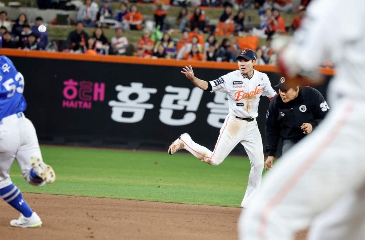 한화 유격수 심우준이 14일 대전한화생명볼파크에서 열리는 2026KBO리그 한화이글스와 삼성라이온즈 경기 6회초 2사 만루 삼성 박승규 타구를 힘들게 잡아 2루로 토스하고 있다. . 2026.04.14.
