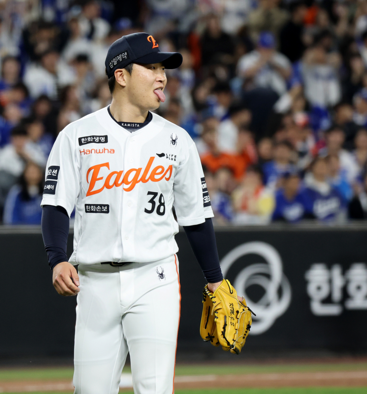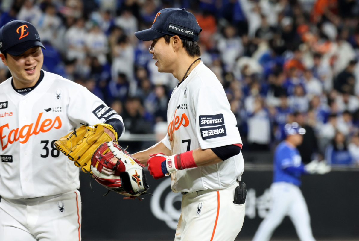 한화 우완불펜 김종수가 14일 대전한화생명볼파크에서 열린 2026 KBO리그 한화이글스와 삼성라이온즈 경기 6회초 2사 만루 상황에 등판했다. 심우준이 삼성 박승규의 타구를 잡아 2루로 토스하며 이닝을 끝내자 김종수는 미소지었다. 김종수는 수비 도움에 화색을 보였다.