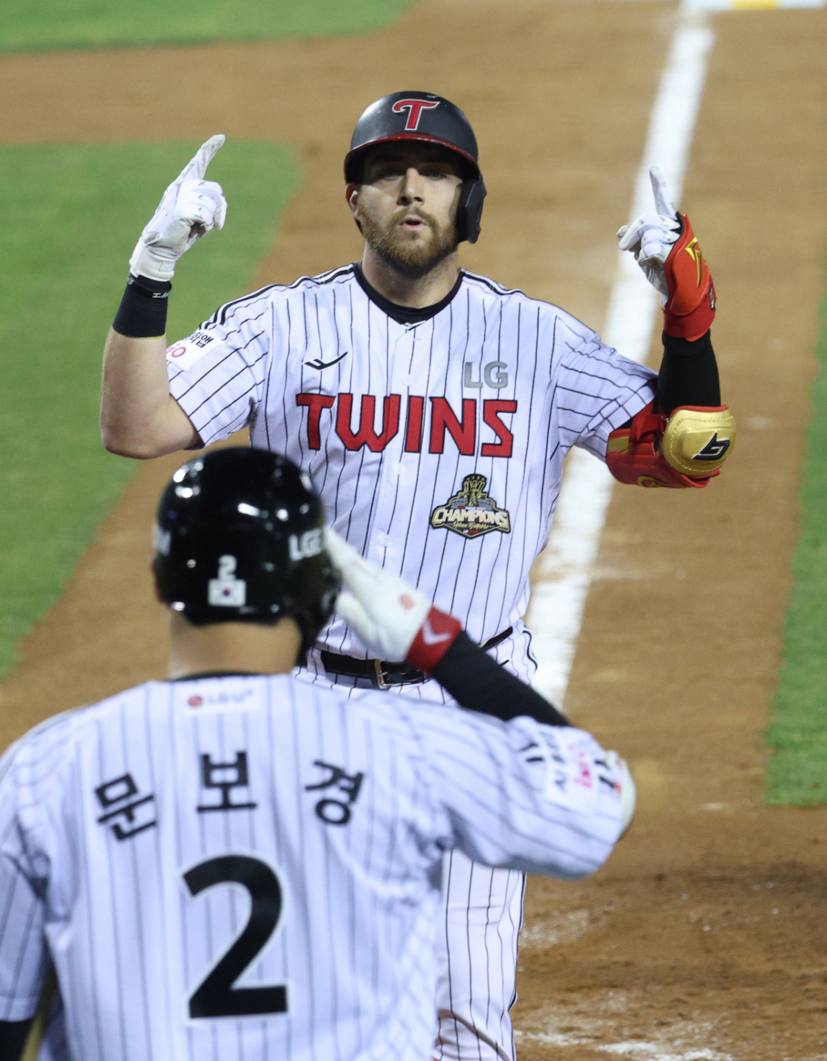 LG 오스틴이 8회말 무사에서 롯데 박정민을 상대로 역전 좌월 1점 홈런을 날리고 홈인하고 있다.