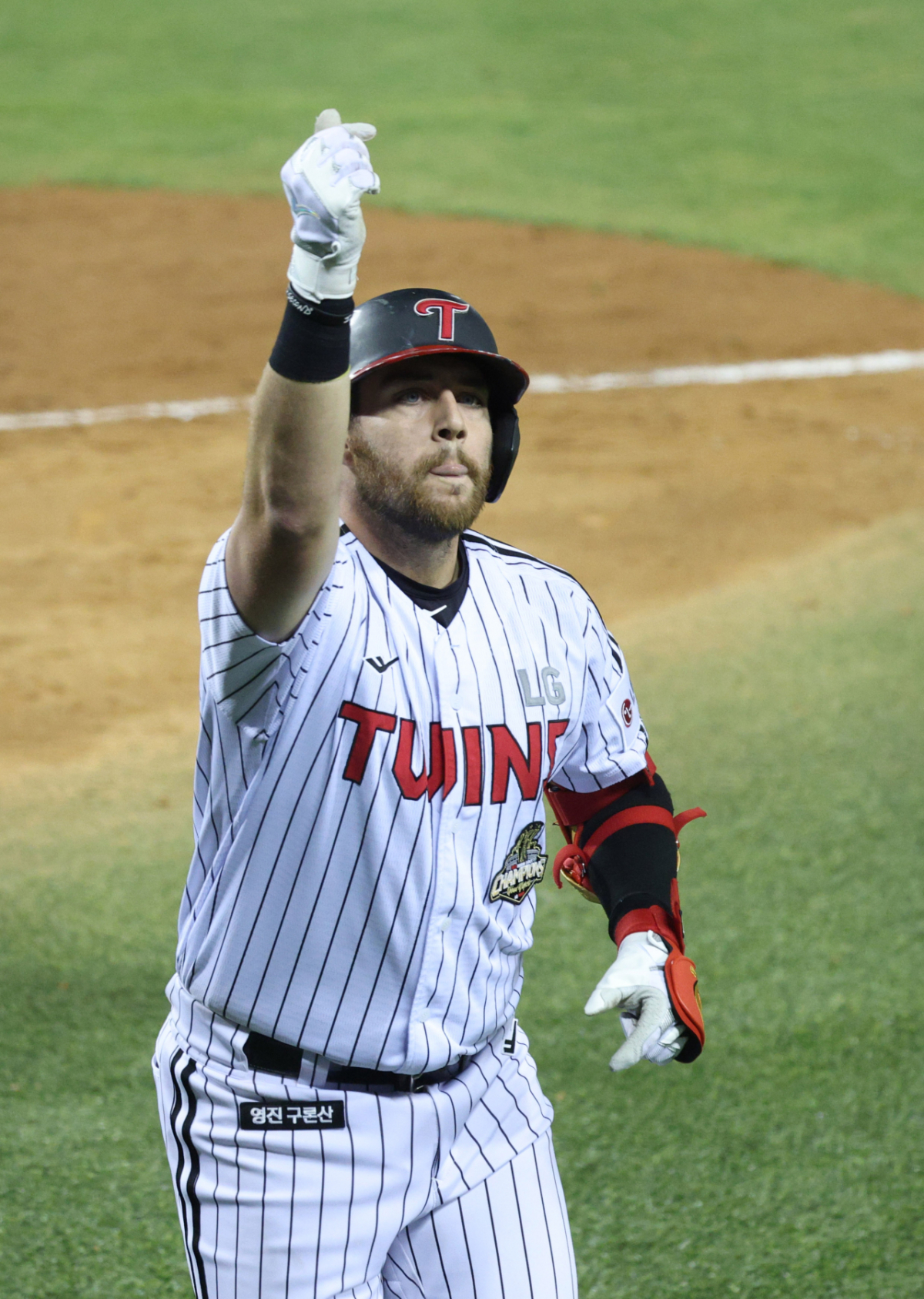 LG 오스틴이 8회말 무사에서 롯데 박정민을 상대로 역전 좌월 1점 홈런을 날리고 홈인하고 있다.